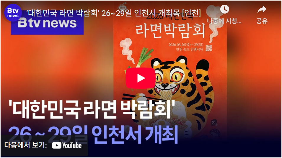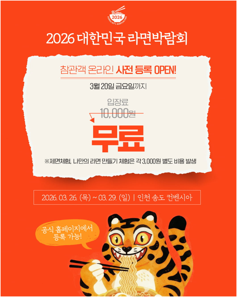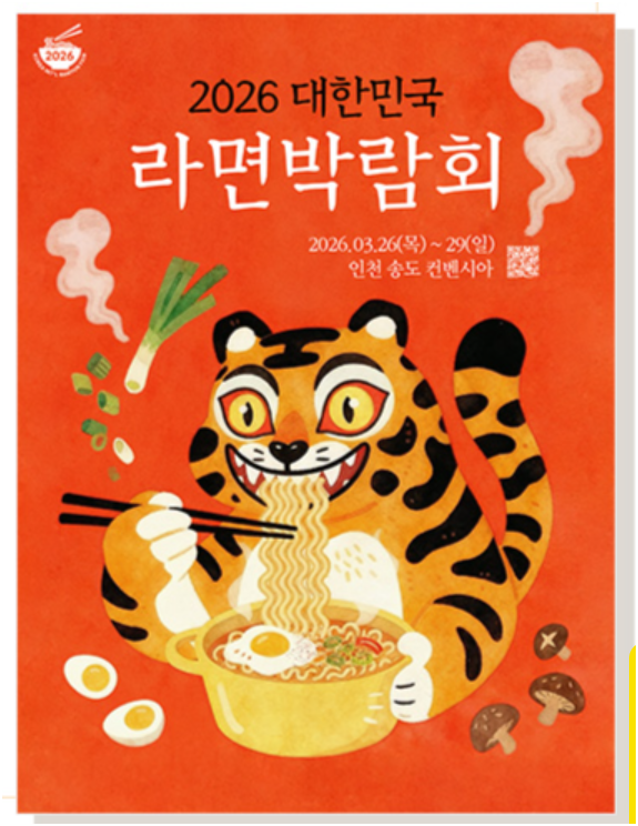 2026 대한민국 라면박람회는 인천 송도 컨벤시아에서 2026년 3월 26일부터 3월 29일까지 진행됩니다. 국내외 다양한 라면 브랜드와 식품 기업들이 참여하여 새로운 제품과 트렌드를 소개하는 행사로 많은 방문객이 예상됩니다.